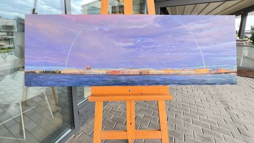 Английская набережная. Приглашение в Петербург 50х150 холст/масло 2025 ••• Выставка «П. А. Р. К.» и при чем здесь Английская набережная? - спросите вы. Можно сказать, как искусствовед: «Петербургский апломб полностью поглощает природу и замещает собой (историей, культурой) стихию». Но мы то с Вами знаем, что любая прогулка в Петербурге начинается с воды, а где еще художнику найти вид, как не со стороны Академии Художеств? Дмитрий Краснов в своей традиции пишет Петербург очень комплиментарно - свинцовое нависшее небо превращается у него в прекрасную ультрамариновую синь...