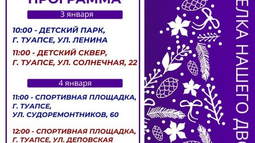 " 🎄 3 января 10:00 - Детский парк (г. Туапсе, ул. Ленина) 11:00 - Детский сквер (г. Туапсе, ул. Солнечная, 22) 4 января 11:00 - Спортивная площадка (г. Туапсе, ул. Судоремонтников, 60) 12:00 - Спортивная площадка (г...
