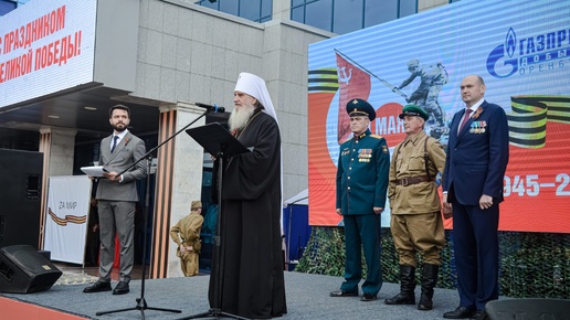 Еще одно праздничное мероприятие сегодня - выставка военной техники и экспонатов поисковых отрядов на площади перед ДКиС «Газовик». Здесь также работала полевая кухня и звучали песни военных лет. Митрополит Петр поздравил всех Оренбуржцев с 80-летием Победы...