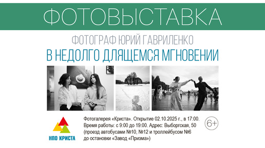«В недолго длящемся мгновении» – так называется выставка выдающегося российского мастера фотографии Юрия Гавриленко, которая откроется в фотогалерее «Криста» 2 октября. Будет представлено 50 чёрно-белых снимков, выполненных в технике чёрно-белой аналоговой фотографии в 2010-2025 годах. Автор приедет на открытие. Юрий Гавриленко – профессиональный математик, занимающийся плёночной фотографией с начала 2000-хгодов. В 2010-х годах состоялись две персональные выставки Юрия Гавриленко. Автор говорит о...