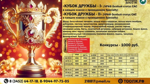 ⏰ 17 - 18 янв (50д) 🏛 #Тюмень #Россия #Выставка 🐶 Выставка собак: КУБОК ДРУЖБЫ 🏆 Тюменское областное объединение любителей животных Контакты и вопросы организаторам здесь: 🌐 https://www.petsman.ru/vystavki-sobak.php?mesto=68-tyumen 2 ВЫСТАВКИ ЧРКФ ОС + САС II, IX гр. «КУБОК ДРУЖБЫ - I» (ЧРКФ Особый статус CAC в каждом классе с проведением Specialty) «КУБОК ДРУЖБЫ - II» (ЧРКФ Особый статус CAC в каждом классе с проведением Specialty) Моно: бельгийские...