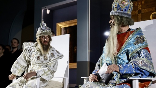 Зал музея в полумраке, все лучи света сошлись в одной точке — иконе «Поклонение Кресту». На ней перед семиконечным крестом склонились в молении и первосвященник, и монарх. А вокруг словно звучанием с самих небес, открывая нам единственный верный путь, величественные голоса мужского хора выводят «Ищите Бога». Два двора Царь и Патриарх — их понимание друг друга, их споры и их согласие определяли русскую историю на протяжении долгого времени. Потому что всегда, не взирая какие бы имена не скрывались...