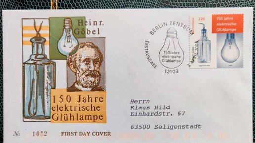 Поделюсь интересным конвертом из моей небольшой коллекции с почтовыми марками на тему электротехники. Конверт первого дня (КПД) "150 лет электрической лампе накаливания", Германия, 2004 год. Этот конверт с почтовой маркой был посвящен лампе накаливания Генриха Гёбеля, которая, согласно даты на конверте, была изобретена в 1854 году (за 25 лет до лампы накаливания Томаса Эдисона). Генрих Гёбель был часовщиком и изобретателем немецкого происхождения. В 1848 году он эмигрировал в Нью-Йорк, где жил до самой смерти...