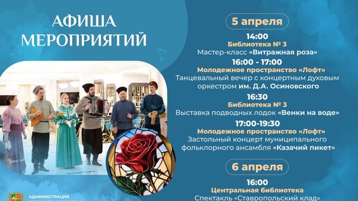 Ставропольские учреждения культуры приготовили для горожан разнообразную программу на ближайшие выходные: от мастер-класса по витражной росписи до выставки моделей подводных лодок и необычного театрального спектакля. Посетители библиотеки № 3 завтра смогут приобщиться к искусству и попробовать себя в роли художника. В 14:00 начнется мастер-класс «Витражная роза», где под руководством специалиста участники освоят технику росписи витражей и узнают об этом виде декоративно-прикладного творчества. (6+) В пространстве «Лофт» 5 апреля в 16:00 концертный духовой оркестр имени Д...