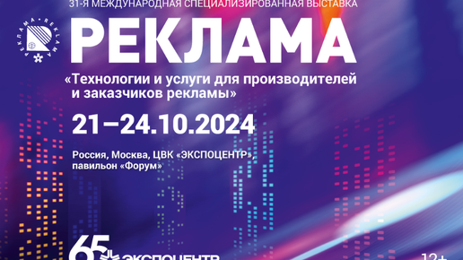 С 21 по 24 октября 2024 г. в ЦВК «ЭКСПОЦЕНТР» на Красной Пресне пройдет 31-я международная специализированная выставка «Реклама-2024». Выставка проводится АО «ЭКСПОЦЕНТР» под патронажем Торгово-промышленной палаты Российской Федерации, при поддержке Ассоциации коммуникационных агентств России (АКАР). «Реклама» – ключевое отраслевое мероприятие для профессионалов рекламного рынка и значимая профессиональная площадка в России для демонстрации технологий и услуг для производителей и заказчиков рекламы...
