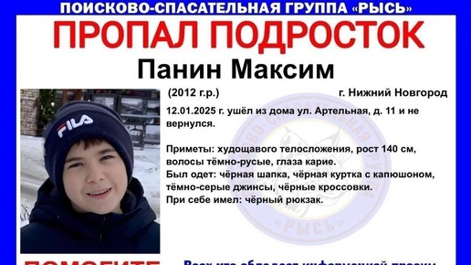 В Нижнем Новгороде разыскивают 13-летнего Максима Панина, который пропал 12 января. Информация об этом была распространена в социальных сетях поисково-спасательным отрядом «Рысь». Известно, что Максим вышел из своей квартиры, расположенной в доме №11 по улице Артельной, и до настоящего времени не вернулся. Описывается, что у мальчика худощавое телосложение, его рост составляет 140 сантиметров, волосы темно-русые, а глаза карие...