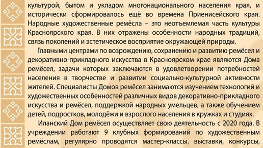 » Народные художественные ремёсла – это неотъемлемая часть культуры Красноярского края. В них отражены особенности традиций, связь поколений и эстетическое восприятие окружающей природы. Экспонаты выставки – результат кропотливого труда мастеров и специалистов Дома ремёсел Иланско-Нижнеингашский муниципальный округа. Все представленные работы созданы нашими современниками – талантливыми умельцами, которые не только владеют древними техниками, но и преподают, вдохновляя новых учеников, побеждают в профессиональных конкурсах...