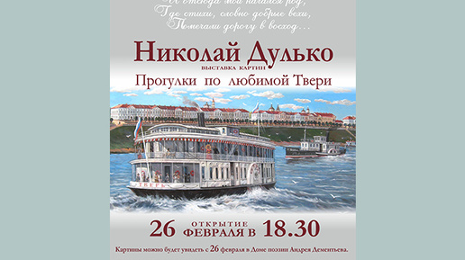 В тверском «Доме поэзии Андрея Дементьева» откроется выставка члена Союза художников России и Союза дизайнеров России Николая Дулько. Выставка называется «Прогулки по любимой Твери» и дает возможность посетителям узнать, каким наш город был раньше, увидеть улочки, по которым когда-то гуляли знаменитые литераторы, гостившие в нашем крае: А.С. Пушкин, Ф.М. Достоевский, М.Е. Салтыков-Щедрин, А.Н. Островский и многие другие. В экспозиции представлены работы, написанные маслом и пастелью. Кроме того, автор впервые представит картины на латунной основе в форме старинных уличных номеров...