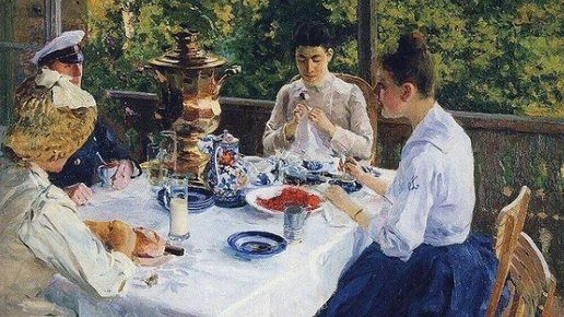Ключевой работой Коровина стал холст «За чайным столом». Все герои полотна достаточно известные личности. Елена Поленова – сестра хозяина усадьбы, известный график и иллюстратор детских книг. Она сидит спиной к нам в скромной дачной шляпке. Напротив расположилась Наталья Поленова. А справа – юная художница Мария Якунчикова. Особое внимание привлекает друг семьи, сидящий справа, молодой офицер Вячеслав Зиберов.
