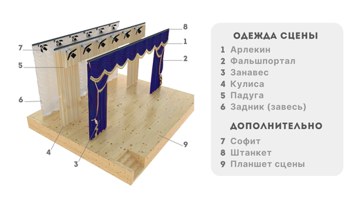Одежда сцены является одним из главных атрибутов сценической площадки и важной декоративной частью интерьера всего зрительного зала. Одежда сцены - это ее текстильное оформление. Но это не просто шторы или занавес, а сложный комплект, в котором каждый предмет играет свою важную роль: