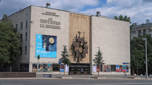 Здравствуйте, друзья. Наверняка каждый из вас видел это здание на Садовом кольце с фантастическими часами. Это легендарный театр кукол Образцова, один из самых известных кукольных театров в мире. И сегодня о нем будет наш рассказ. Здание театра спроектировал в 1970 году известный архитектор-модернист Юрий Шевердяев в форме авангардного кубика, он же спроектировал и кинотеатр «Россия». Здание театра состоит из двух строений, но при этом выглядит едино и монументально. В центре для часов была специально спроектирована ниша...