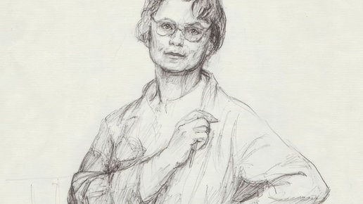 Завьялова Галина Петровна (08.08.1925, Ленинград - 10.03.2007, Химки). «Автопортрет». Эскиз к литографии «В изостудии». 1970-е гг.; Бумага, шариковая ручка; 250 х 245 мм.; (Химкинская картинная галерея им...