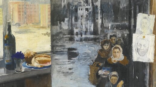 Картина "Воспоминание о хлебных карточках" сейчас представлена на большой выставке Юрия Пименова в Третьяковской галерее. И у некоторых посетителей она вызвала недоумение: неужели художник хотел сказать, что мирно стоящий на подоконнике бутерброд - то, за что воевали?! Согласна, соседство очереди из военных лет и сытного натюрморта тонким художественным решением не назовёшь. И, наверно, это не самая удачная картина Пименова. Но, конечно, художник не думал никого оскорблять. Всю войну Пименов был в Москве, не считая командировок на фронт: работал над плакатами и картинами...