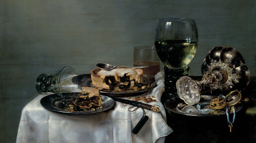 Я сижу за столом в своей комнате и разглядываю старую открытку с голландским натюрмортом - "Завтрак с ежевичным пирогом" (Виллем Клас Хеда, 1631). Читаю слова на обратной стороне: "...скатерть смята, пирог надломлен, бокал и ваза опрокинуты."