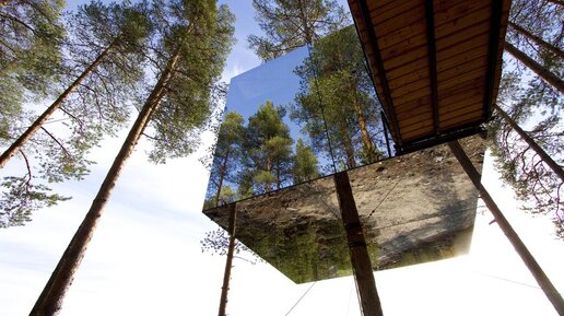 В зеркальном кубе, пристроившемся на деревьях в лесной глуши, отражается все, что его окружает: лесная глушь, поляна и небо, поэтому конструкцию размером 4х4х4 м человеческий глаз не сразу и заметит. А чтобы птицы не врезались, куб «укутан» инфракрасной пленкой, которую пернатые, в отличие от людей, видят. Весь интерьер из березовой фанеры. Кроме спальни для двоих имеются гостиная, ванная и даже терраса на крыше. В отеле есть и другие удивительные апартаменты: в виде НЛО, птичьего гнезда или стрекозы...