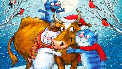 Весёлый зимний разгуляй синих котов в живописи художницы Рины Зенюк.