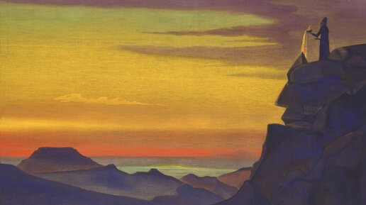 У Николая Константиновича Рериха есть величественная и торжественная картина: на вершине высокой скалы Старец держит в руках пламенную чашу и изливает из неё огонь на землю («Зороастр», 1931 г.).