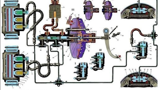 Всем привет! Сегодня поговорим о комбинированной разводке тормозных контуров. Которая занимает промежуточное положение между системой с передним и задним контуром и диагональной. В качестве примера рассмотрим тормозную систему автомобилей ВАЗ 2121 и АЗЛК 2140 Они имеют некоторые сходства: 1) Передние суппорта многопоршневые. На Ниве суппорт имеет 3 одинаковых цилиндра. У Москвича - 1 один большой другой малы.; 2) Тормозные контуры. Они не просто передние или задние. Как на классике. Они комбинированные...