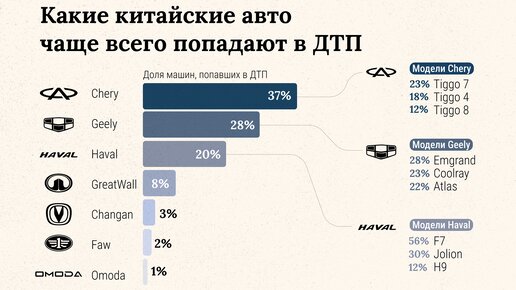 В начале 2024 года появились значимые выводы о китайских автомобилях, где Geely, Chery, Haval чаще всего оказываются в ДТП. В информации от «Страхового дома ВСК», более 60% всех подобных инцидентов связаны именно с этими марками. Владельцам автомобилей марки GAC приходится сталкиваться с самыми высокими затратами на ремонт после столкновений. Согласно этим данным, средняя сумма возмещения за ремонт автомобилей марки GAC по ОСАГО составляет 152 000 рублей. Значительные суммы также требуются для Haima...