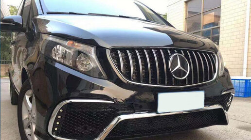 Еще одна новинка - вариант рестайлинга Мерседеса V класса - аэродинамический обвес в стиле AMG GT. Обвес просто здОрово смотрится на микроавтобусе, подчеркивает статус владельца и выглядит очень стильно. В комплект обвеса входит передний бампер с решетками и крепежами, задний бампер с катафотами и насадками глушителя и решетка радиатора с вертикальными планками, как у AMG GT. Обвес изготовлен из полипропилена, этот тот самый материал, из которого изготовлены штатные, заводские бампера...