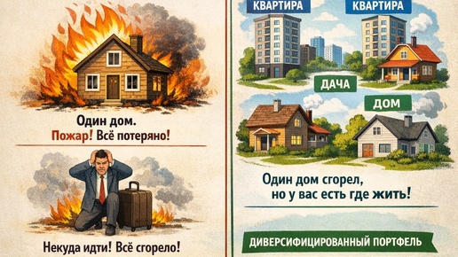 Тут пришло в голову небольшое сравнение инвестиций в акции и своего имущества - если у вас есть три квартиры, дом и дача, то потеря одного из этих объектов сильно не приятна, но и всегда есть где пожить. А вот если у вас единственное жильё, да еще в ипотеке, а рядом нет никого из родственником, либо они проживают в другом регионе и туда уезжать не вариант - тут уже потеря единственного жилья накладывает множество сложностей: аренда жилья, перевозка и хранение вещей, а если вещей не осталось , то еще сложней...