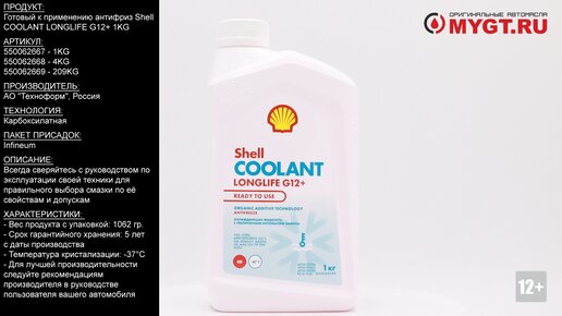 Продукт: Готовый к применению антифриз Shell COOLANT LONGLIFE G12+ 1KG Наш телефон: 8-800-550-57-22 ПН-ПТ 9.00-17.00 (МСК+4) Артикул: 550062667 - 1KG 550062668 - 4KG 550062669 - 209KG Производитель: АО "Техноформ", Россия Технология: Карбоксилатная. Пакет присадок: ----------- Ссылка для покупки: https://mygt.ru/Oil/selection/antifriz-shell-longlife-ultimate-protection-1-kg.html Описание: Готовая к применению охлаждающая жидкость/антифриза на основе карбоксилатной технологии. Shell...
