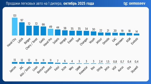 Независимый эксперт Олег Мосеев, когда-то возглавлявший ассоциацию российских дилеров, подсчитал, сколько машин в среднем продали автосалоны в октябре. В расчете на марки. Статистика эта сложнее, чем может показаться, потому что зачастую в одном шоуруме работают менеджеры сразу двух или нескольких брендов. "В данном случае имеются ввиду продажи на один дилерский центр, не физическое здание. Если Haval разделен на две сетки – City и Pro, то Changan без выделения Uni в силу того, что дилеры двух суббрендов занимаются перекрестными продажами", - пояснил Мосеев...