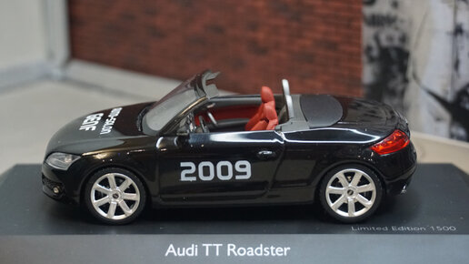 Audi TT Roadster Type 8J Auto Salon Genf 2009 Schuco Limited car in scale 1/43 История появления автомобиля Разработка Audi TT началась в сентябре 1994 года в Audi Design Center в Калифорнии. Впервые TT была показана в качестве концепт-кара на Франкфуртском автосалоне в 1995. Заниматься дизайном было поручено Джею Мейсу (англ. J Mays), Фримену Томасу (англ. Freeman Thomas) и Мартину Смиту (англ. Martin Smith), разработавшим успешный дизайн интерьера. Адаптация под ранее не использовавшуюся бесшовную лазерную сварку для 1-го поколения TT задержала выпуск автомобиля...