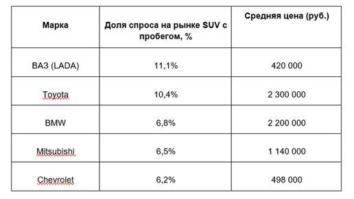 Эксперты Авито Авто по просьбе редакции SpeedMe проанализировали данные о спросе на кроссоверы и внедорожники (SUV) с пробегом на платформе летом 2022 года, и составили топ самых востребованных брендов и моделей. Наибольшей популярностью среди SUV с пробегом пользуются проверенные временем автомобили массового сегмента, а также комфортабельные машины премиум-сегмента. Доля кроссоверов и внедорожников в общей структуре спроса на автомобили на Авито Авто летом 2022 года составила 14%. Средняя стоимость автомобиля с пробегом сегмента SUV на Авито Авто — 1 290 000 рублей...