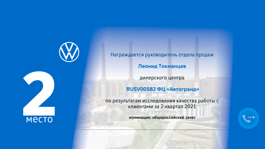 Volkswagen Group RUS высоко оценила результаты работы дилерского центра Volkswagen "Автогранд" по результатам исследования качества работы с клиентами за 2 квартал 2021. Мы стараемся для вас, наши любимые клиенты...