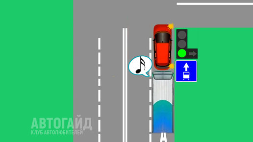 Водитель красной машины, двигаясь в центре города, подъезжает к перекрестку и собирается повернуть направо. Для этого автолюбитель перестраивается на правую полосу, которая предназначена для маршрутных ТС (об этом говорит знак 5.14) и включает правый поворотник. Однако совершить он свой манёвр не может - основная секция светофора горит зеленым, тогда как стрелка - нет. В это время сзади подъезжает маршрутка-автобус, который хочет проехать прямо, но не может из за красной машины. Он начинает недовольно...