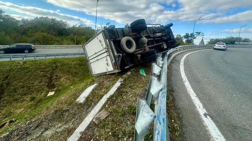 Грузовой Mitsubishi опрокинулся на развязке во Владивостоке