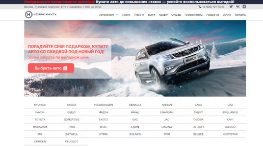 Независимость — это автосалон в Москве. Занимается продажей новых автомобилей. Каталог размещен на сайте nezavisimost.su. Ресурс оформлен с нарушениями. В частности владельцы нарушают Федеральный закон "О рекламе" № 38-ФЗ. Больше интересного — в нашем обзоре. Обновлено 11.09.2025 Автосалон ранее находился в Москве на Духовском переулке 17с4, сейчас он переехал на Береговой проезд 4/6с3. Отметка о переезде есть на Я.Картах: По новому адресу также находятся Redegi, АЦ Береговой, Кар Спот, Kosmos-Cars, MG Независимость, Тульская, Autogansa, Livan Независимость...