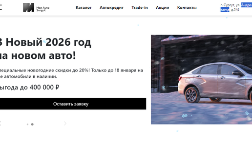 Max Auto Surgut — это автосалон в Сургуте. Занимается продажей новых автомобилей. Является рекламным дублером дилера из нашего черного списка. Больше интересного — в нашем обзоре. В автосалоне на Андреевском заезде 2/4 в Сургуте можно купить новый автомобиль. Дилер предлагает большие скидки — до 400 00 рублей (а если ориентироваться на цены в каталоге, то еще больше) на автомобили в наличии. Правда, какие именно авто есть в выставочном зале — непонятно, так как этой информации нет на официальном сайте...