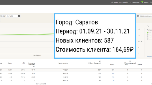 Сегодня мы делимся результатами по привлечению клиентов в автосервисы за прошедшую осень 2021 года. Для примера возьмем три разных автосервиса, расположенные в Саратове, Краснодаре и Ставрополе. И сравним их результаты. Погнали! Для каждого клиента нами были настроены рекламные кампании в Яндекс.Директ, разработаны посадочные страницы. г. Саратов, автосервис слесарного ремонта: Рекламный период: 01.09-30.11 Получено обращений от новых клиентов: 587 Средняя стоимость обращения: 164,69 р. г. Краснодар, автосервис слесарного ремонта: Рекламный период: 01...