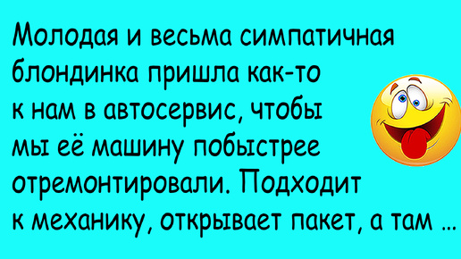Как вы думаете, где больше всего случается курьезных историй? Мне кажется, что в автосервисе. Чего там только не насмотришься. Особенно, когда приезжают женщины. Особенно, когда приезжают молодые женщины. Так вот, недавно молодая блондиночка приехала к нам ремонтировать свое транспортное средство. Точнее, транспортное средство привезли чуть раньше, на эвакуаторе. Механик ей позвонил, и сказал, что надо приобрести для того, чтобы машину отремонтировать. Ну она и пришла. И пришла с огромным пакетом запчастей...