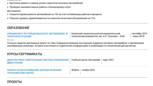 Пример резюме автослесаря по ремонту легковых автомобилей 2025