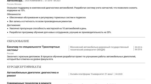 Изучение Примера резюме Автослесаря — лучший способ понять, как составить свое эффективное резюме. Это поможет вам быстро пройти отбор и получить желаемую работу. 💪 В этой статье вы найдете готовые примеры резюме для Автослесарей разного уровня опыта. Мы предлагаем пошаговые инструкции по каждому разделу, учитывая актуальные для начинающих и опытных специалистов. Изучив пример, вы сможете создать резюме с помощью нашего конструктора резюме. Заголовок резюме должен быть четким, лаконичным и отражать вашу специализацию...
