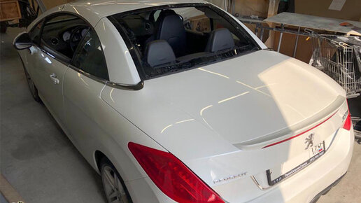 Как же мне нравятся белоснежные автомобили! Белый, нарядный, а еще и кабриолет!!! Но даже с такими авто случаются неприятности, у этого Пежо (Peugeot) 308CC разбилось заднее стекло. Кстати, с ремонтом кабриолетов очень странная ситуация - большинство дилеров не берутся ремонтировать кабриолеты, либо прямо отказываются, либо ссылаются на большую очередь и все равно не берут в работу. Конечно же, с кабриолетами есть большие и иногда сложные нюансы по ремонту. Дилеры умеют менять детали блоками и чаще всего предлагают замену полностью складной крыши...