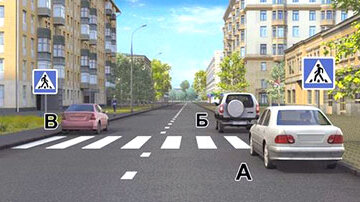 Водители каких автомобилей нарушили правила остановки? 1. Только автомобиля А. 2. Автомобилей А и Б. 3. Автомобилей А и В. 4. Всех автомобилей. Правильный ответ №3. На данной дороге остановка разрешена как справа, так и слева (п...
