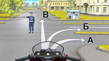 Вам разрешено движение: 1. Только в направлении А. 2. В направлениях А и Б. 3. В любом направлении из указанных. Правильный ответ №1. Со стороны груди регулировщика, когда его правая рука вытянута вперед, Вам разрешен только поворот направо по направлению А (п...