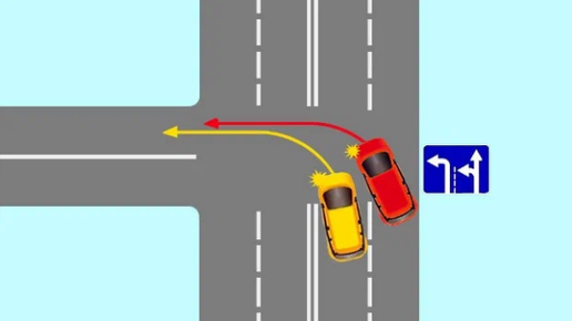 Это сложный билет, который даже опытный водитель может ʒаполнить неправильно. Желтый автомобиль движется по левой полосе и приближается к перекрестку. Водитель хочет повернуть налево. В это же время красный автомобиль в правой полосе поворачивает налево и хочет совершить тот же маневр - повернуть на перекрестке налево, но с правой полосы. Ситуация осложняется тем, что два автомобиля хотят свернуть с двух полос на одну. Однако ни один иʒ водителей не хочет уступать дорогу. Кто имеет преимущество,...