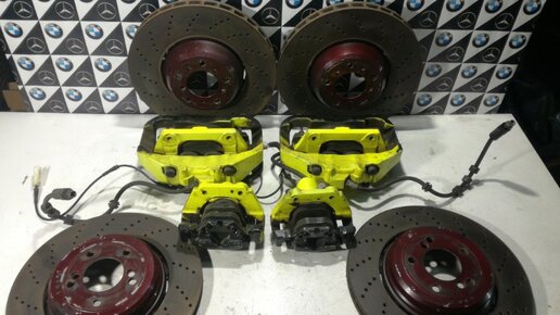 Тормоза Оригинал БМВ Е60 М5 комплект: передние диски 2шт номер детали: (34112282805, 34112282806) d 374 без износа, толщина 36; задние диски 2шт номер детали: (34212282807, 34212282808)d 370 износ 1мм, толщина 23; передние суппорта в сборе 2шт, колодки жирные; задние суппорта в сборе, колодки жирные...