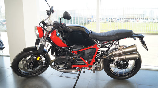 Приветствую, друзья! Знакомьтесь! Перед вами дорожный мотоцикл BMW R nineT Scrambler, 2021 модельного года. Версия двойного назначения: трасса и легкое бездорожье. В общем самый настоящий сельский вариант! Начнём обзор с щитка приборов, он здесь, как видите на фото выше, самой, что ни на есть простейшей формы (с одним колодцем), где размесилась "механическая" стрелка спидометра и ЖК монитор бортового компьютера. Максимальная, обозначенная скорость обрывается на цифре 220 км/ч. Положить стрелку спидометра этот мотоцикл может легко, главное при этом в штаны не наложить...