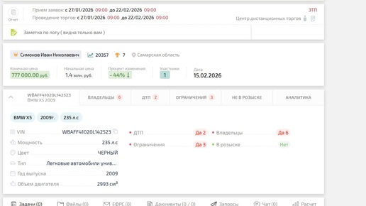 ушёл с торгов со скидкой 44% 🔻 🚗 Лот: BMW X5, 2009 г.в. 📍 Регион: Самарская область 💰 Начальная цена: 1 395 000 руб. ✅ Итоговая цена продажи: 777 000 руб. 📉 Снижение: 618 000 руб. 📊 Скидка от начальной цены: 44% 👤 Участников: 1 Автомобиль забрали за 56% от старта...