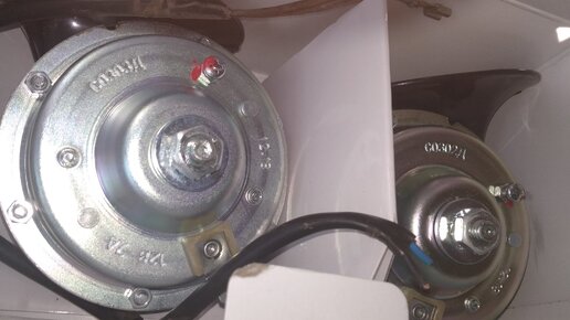 Привет, друзья! Многие владельцы автомобиля Лада калина знакомы с этой проблемой - стандартный звуковой сигнал очень тихий. Он установлен внизу перед радиатором и подвержен попаданию на него грязи и воды. Для решения этой проблемы многие переносят штатный сигнал в другое место, например под подкрылки или под капот. Я же поступил более радикально - заменил его на сигналы от Волги. Фотоотчёт о проделанной работе я и хотел бы сегодня опубликовать. Вот так выглядят сигналы от Волги. Их два. Один - высокой тональности, второй - низкой...