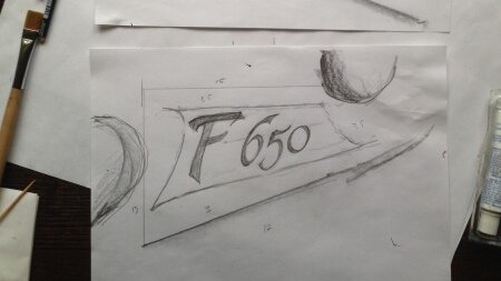 Раз я такой офигенный каллиграф, то почему бы мне не сделать офигенные наклейки на мой офигенный мотоцикл? И правда. Еще на заре приобретения мотоцикла, каждый раз, когда проходил мимо него, косился на оригинальную наклейку с названием модели. Напрягала она меня, не нравилась. В итоге решил отклеить и разработать свою собственную с блэкджеком и поэтессами. А еще лучше две.