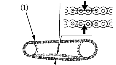 Срок службы приводной цепи зависит от её правильной смазки и регулировки. Неправильное обслуживание может привести к преждевременному износу или повреждению приводной цепи и звёздочек. Проверка и смазка приводной цепи должны составлять неотъемлемую часть осмотра перед поездкой. Выполняйте эти работы чаще, если мотоцикл эксплуатируется в жёстких условиях. Проверка цепи и звёзд Медленно проворачивая заднее колесо, осмотрите приводную цепь и звездочки на предмет наличия следующего: Приводная цепь с повреждёнными роликами, ослабшими осями или отсутствующими стопорными кольцами подлежит замене...