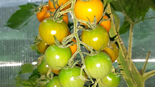 Сегодня, дорогие огородники, я решила написать статью о замечательном гибриде, я бы сказала уникальном, потому что такой потрясающей урожайности помидорок - черри раньше не видела. Завязь 100%-я, на каждой кисти минимум 20 плодов. Цвет очень красивый. В начале созревания лимонный, а в полной биологической спелости тёмно-желтый, янтарный. Сохранность, лёжкость отличная. Я не успевала собирать и перерабатывать урожай салатных томатов, и на "Краски" просто не хватало времени. Так они у меня и висели...