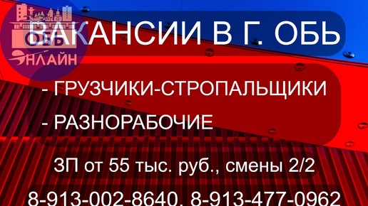 ↗ Вакансии в городе Обь! Требуются грузчики-стропальщики и разнорабочие! Зарплата от 55 тысяч рублей, сменный график 2/2. Звоните по телефонам 89130028640 и 89134770962 #Reklama@ob.gorod vk.ru Подробнее на https://vk...